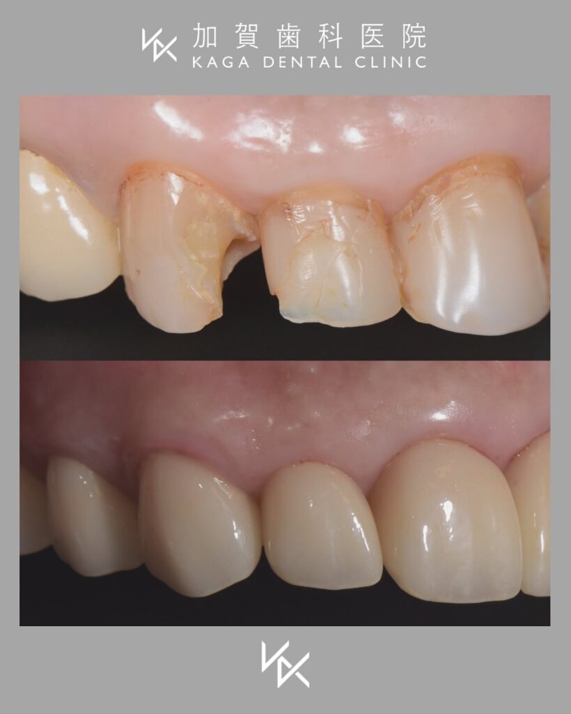 小学生の頃に前歯をぶつけたことをきっかけにブリッジ治療を行い、これまでに被せ物は2〜3回作り替えてきたとのこと。