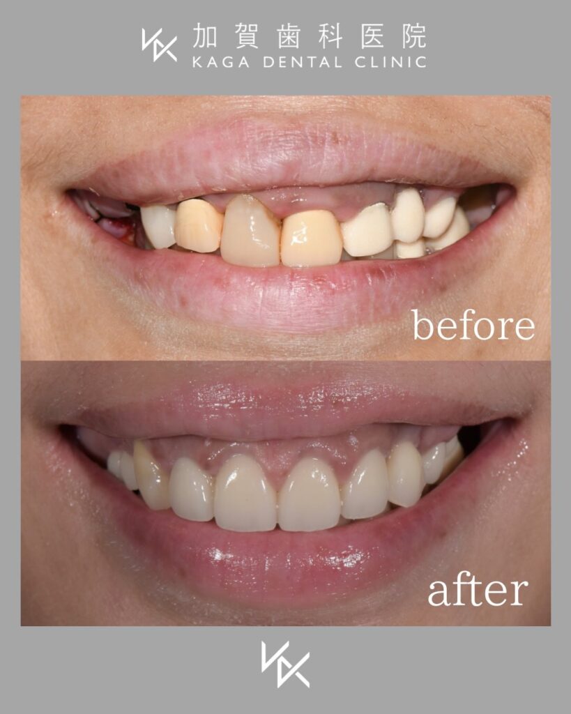 小学生の頃に前歯をぶつけたことをきっかけにブリッジ治療を行い、これまでに被せ物は2〜3回作り替えてきたとのこと。